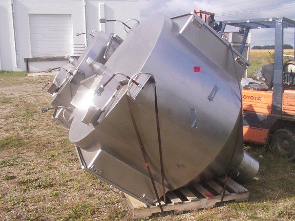 Used Premier Pneumatics Storage Tank with Live Bottom for sale. Item specifics as follows… Stainless steel tank 4′ x 6′ x 2′ straight + 3′ sloped sides to get 13″ x 6′ opening Includes V-trough auger live bottom attachment; variable pitch, extending 3′ beyond tank Inventory #0688